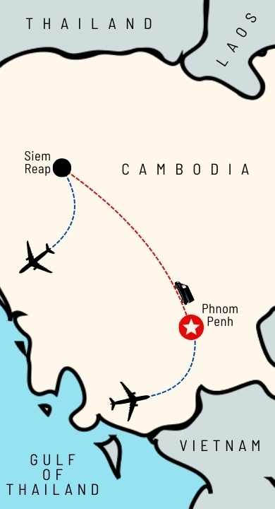 ဒီ ၅ညအိပ်-၆ရက် ခရီးစဥ်လေးက Cambodia ရဲ့ Top Highlight တွေကို ထိတွေ့မယ့် ခရီးလေးပါ… ခရီးစဥ်ကို မြို့တော်ဖြစ်တဲ့ ဖနွမ်ပင် (Phnom Penh) မှာ စတင်ပါမယ်… ဖနွမ်ပင်မှာ လည်ပတ်ပြီးရင် Siem Reap (ဆီယမ်ရိ) မြို့ကိုကားနဲ့သွားမှာပါ… အဲ့ဒီလမ်းက လမ်းကောင်းပြီး လမ်းတလျှောက် ခမာကျေးရွာတွေမပြတ်သလောက်ရှိလို့ ခမာတို့ရဲ့ကျေးလက်ကမ္ဘာကို တစွန်းတစမြင်ရမှာပါ… ဆီယမ်ရိမှာတော့ UNESCO ရဲ့ ကမ္ဘာ့ယဥ်ကျေးမှုအမွေအနှစ်စာရင်းဝင် ကမ္ဘာကျော်အန်ကောဝပ်ကျောင်းတော်အပါအဝင် Highlight တွေကို လည်ပတ်လေ့လာမှာပါ… Departure ကိုတော့ Siem Reap မြို့ရဲ့ Angkor International Airport ကနေ ထွက်ခွာမှာဖြစ်ပါတယ်…