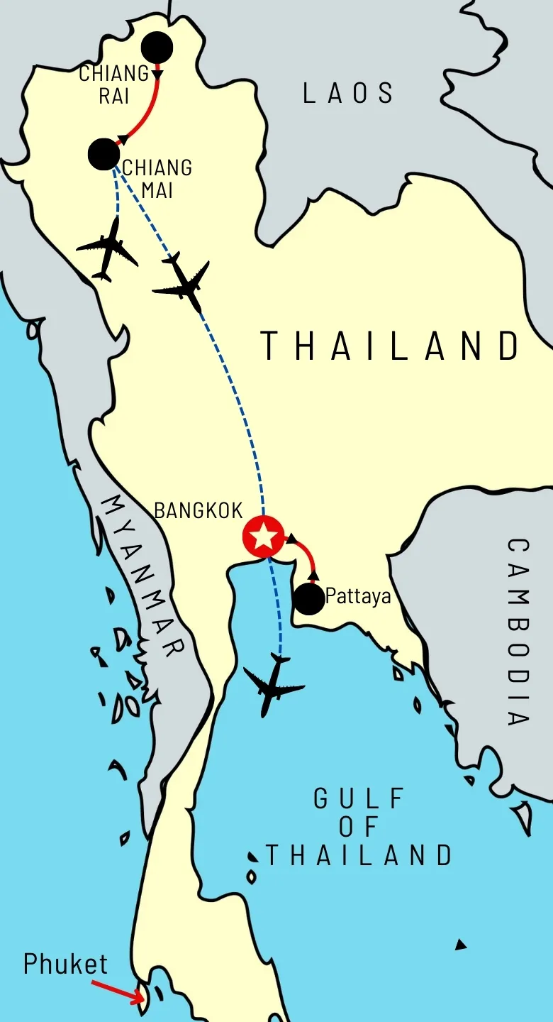 ဒီခရီးစဥ်က ထိုင်းနိုင်ငံရဲ့မြို့​တော်ဖြစ်ပြီးအကြီးဆုံးမြို့လည်းဖြစ်တဲ့ ဘန်​ကောက်မြို့၊ နိုင်ငံ​မြောက်ပိုင်းမှာအကြီးဆုံးဖြစ်တဲ့ နာမည်​ကျော် ချင်းမိုင်မြို့ (Chiang Mai) ၊ လူကြိုက်များတဲ့ ပတ္တယားကမ်း​ခြေမြို့ (Pattaya) တို့ကို လည်ပတ်မယ့် ခရီးစဥ်ပါ… ကြာချိန်က ၆ ညအိပ် – ၇ ရက်မို့ မတိုမရှည်​လေးပါ… ထိုင်းနိုင်ငံအတွင်းမှာ ချင်းမိုင်မြို့မှာ ခရီးစဥ်စတင်မှာဖြစ်ပြီး Departure ကို​တော့ Bangkok က​​နေ ထွက်ခွာမှာဖြစ်ပါတယ်… ဒီ Plan က ထိုင်းနိုင်ငံရဲ့ Major Highlight ​တွေထဲက အ​တော်များများကို ထိ​တွေ့မှာမို့ အချိန်နဲ့​ငွေကုန်ကျမှုကျစ်လျစ်ပါတယ်…