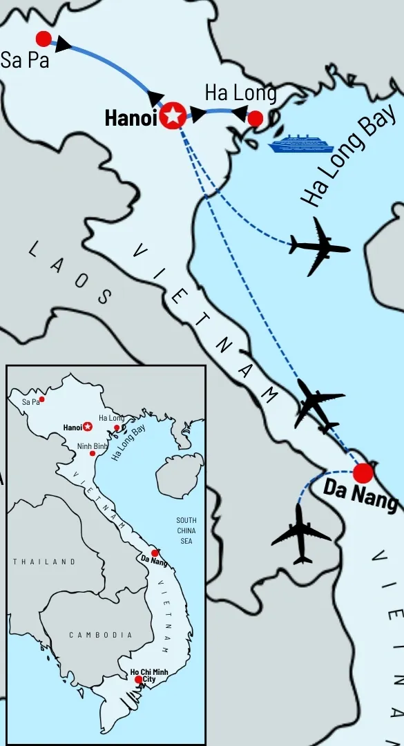 ဒီခရီးစဥ်ကို ဗီယက်နမ်အလယ်ပိုင်နဲ့မြောက်ပိုင်းရဲ့ Top Highlight တွေနဲ့ စနစ်တကျကျစ်ကျစ်လျစ်လျစ် ပေါင်းစပ်ရေးဆွဲထားပါတယ်… ကဲ… အောက်မှာ ခရီးစဥ်လေးကို ကြည့်လိုက်ကြရအောင်…